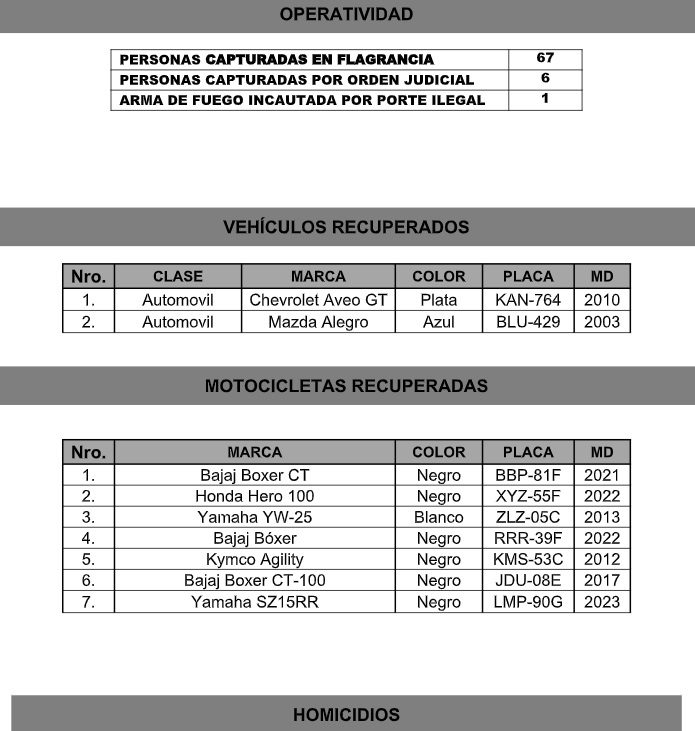 También, dieron a conocer la captura de 67 personas por flagrancia, 6 personas por orden judicial y 1 persona por porte ilegal de arma.