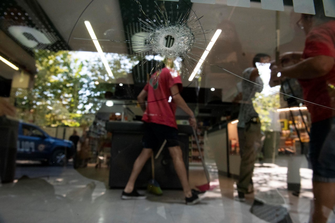 Vista de impactos de bala en el supermercado de la familia de Antonela Roccuzzo, que fue atacado a tiros por dos personas,, en Rosario (Argentina). EFE/Franco Trovato Fuoco