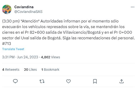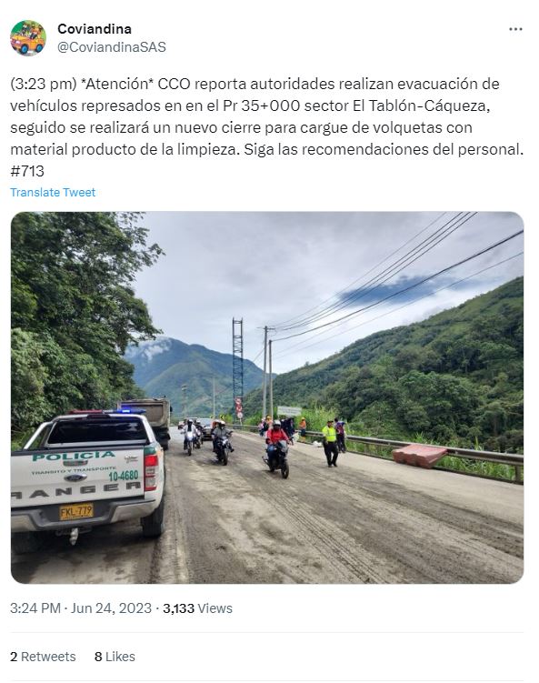 Además, la Concesionaria Vial Andina, Coviandina, informó que habrá un nuevo cierre con el fin de trasladar el material recogido en la zona.
