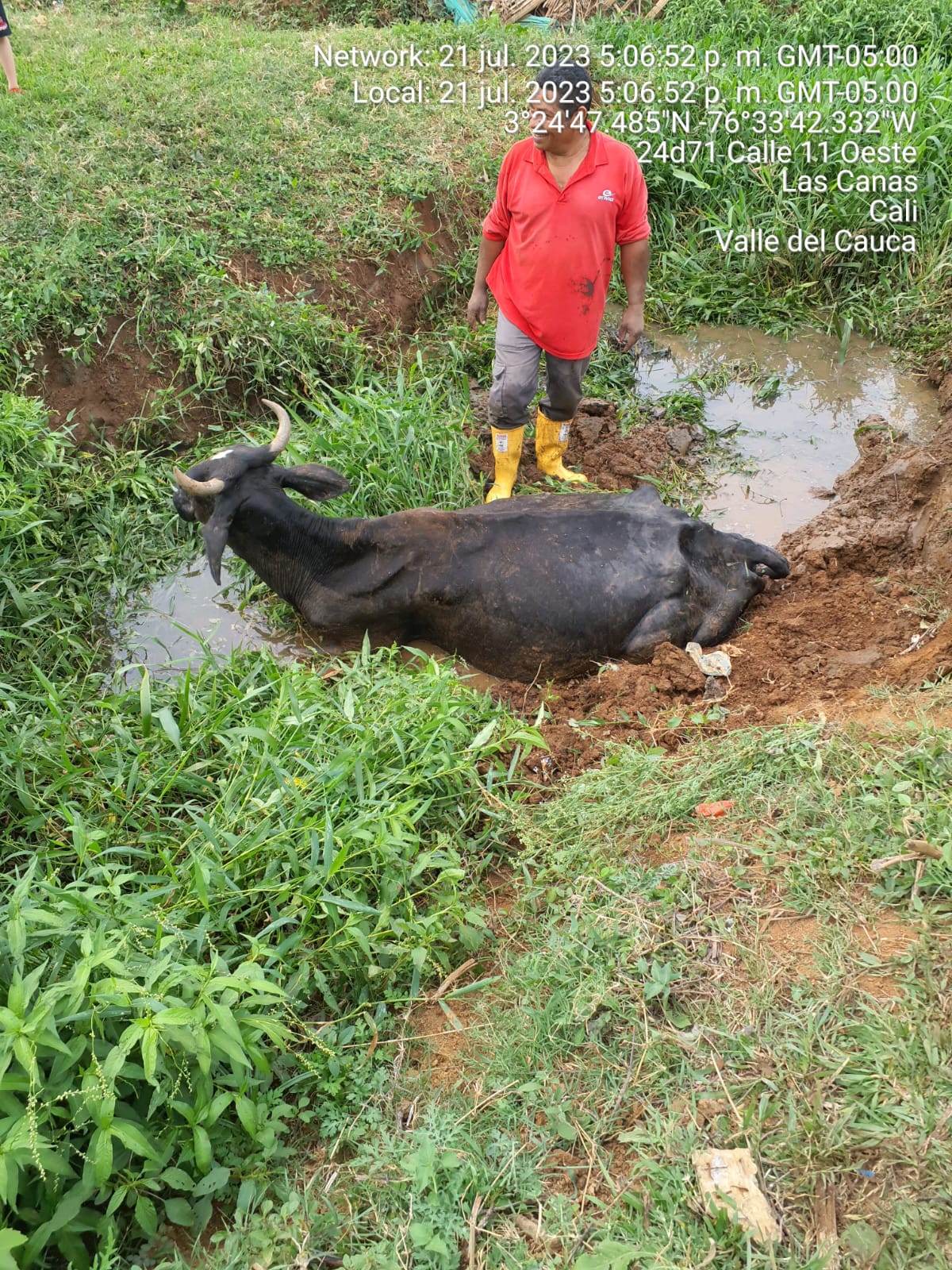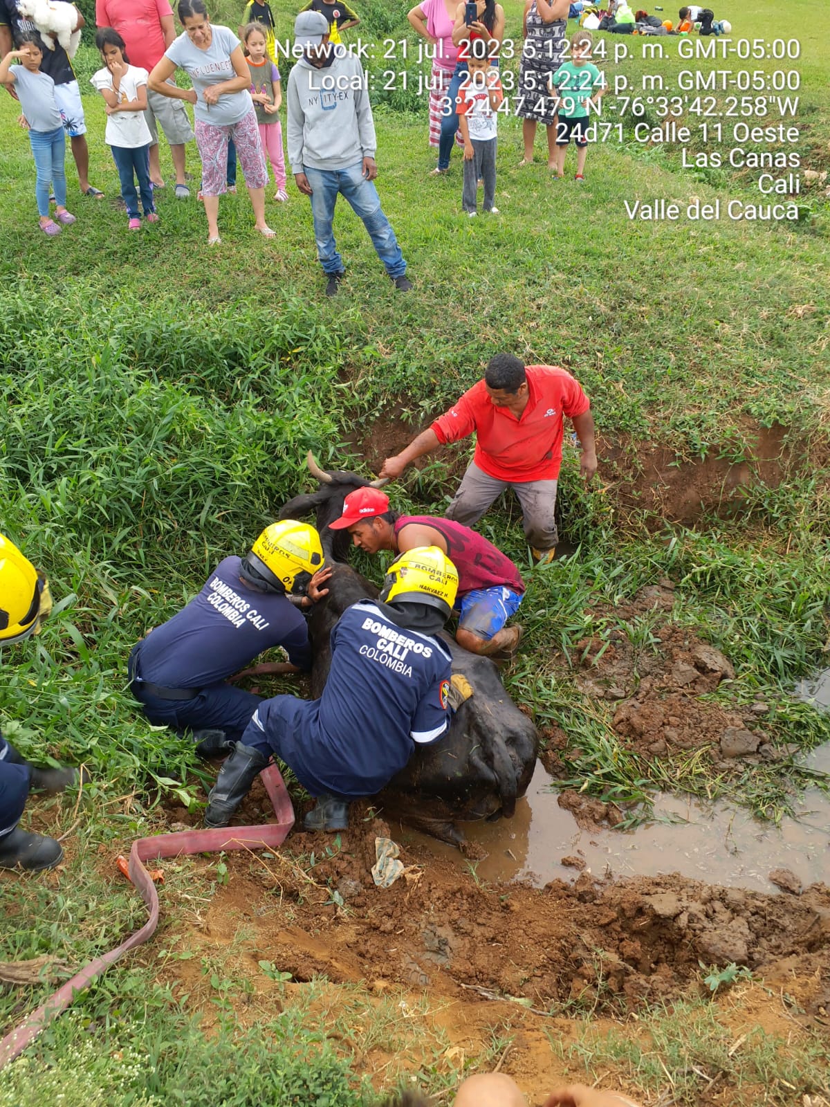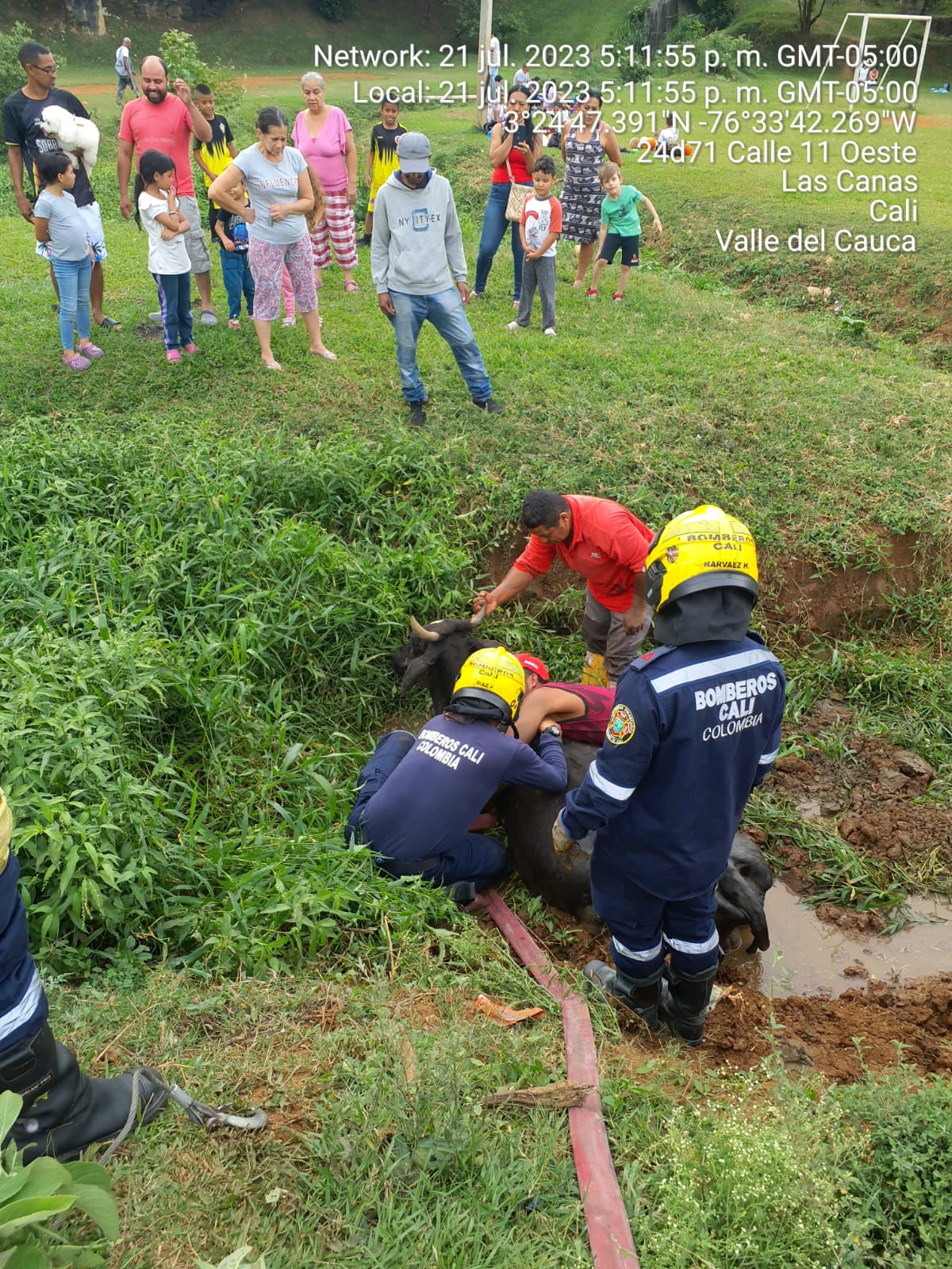 En la tarde de este viernes 21 de julio, el Cuerpo de Bomberos Cali atendió el llamado de rescate a una vaca que quedó enterrada en el lodazal de una cancha, en la Urbanización Venezuela, en Cali.