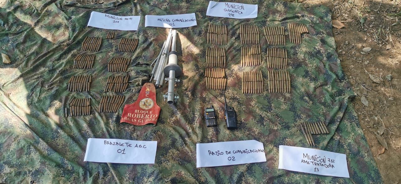 Una vez controlaron el terreno, los militares encontraron un campamento con capacidad para 10 personas, en el que hallaron dos fusiles, una escopeta, más de 500 cartuchos, cuatro proveedores, insumos médicos, intendencia y material alusivo al Clan del Golfo.