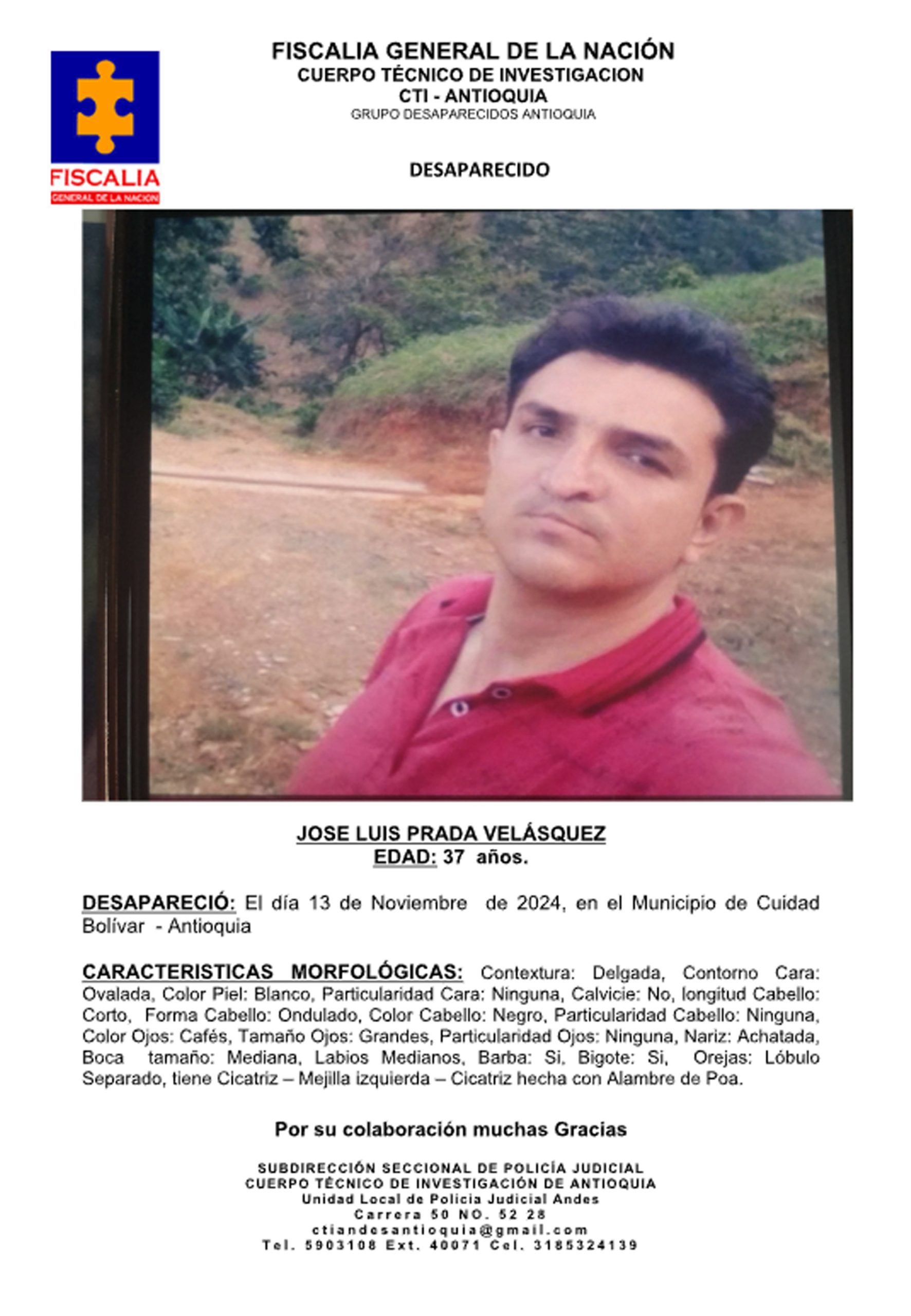 Resumen: José Luis Prada Velásquez, de 37 años, desapareció el 13 de noviembre de 2024 en el municipio de Ciudad Bolívar, Antioquia.