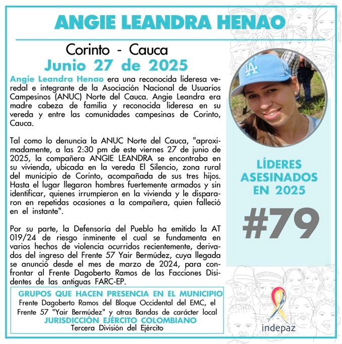 Minuto30.com .- Una nueva y desgarradora noticia enluta al departamento del Cauca. Angie Leandra Henao Zambrano, reconocida lideresa veredal e integrante de la Asociación Nacional de Usuarios Campesinos (ANUC) Norte del Cauca, fue asesinada a sangre fría la tarde de este viernes 27 de junio de 2025. Con su muerte, asciende a 79 el número de líderes y defensores de Derechos Humanos asesinados en Colombia en lo que va de 2025, según el lamentable registro de Indepaz.