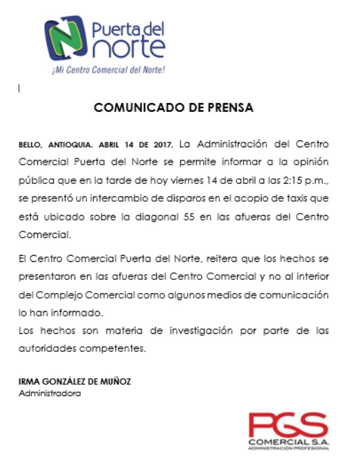 Puerta del Norte se pronuncia sobre balacera en el Centro de Acopio. Comunicado