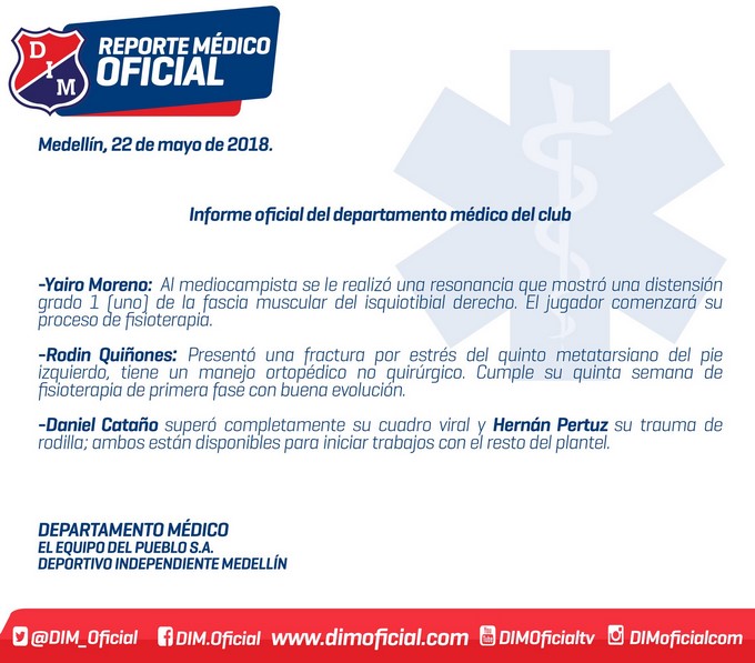 El Deportivo Independiente Medellín reveló el informe médico de algunos de sus jugadores que han presentado molestias en las últimas semanas.