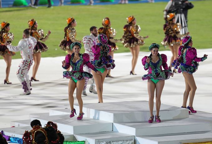 Jóvenes bolivianas bailan la danza de los Caporales durante la ceremonia inaugural de los Juegos Suramericanos 2018 este sábado 26 de mayo de 2018, en el estadio Félix Capriles de la ciudad de Cochabamba (Bolivia). EFE