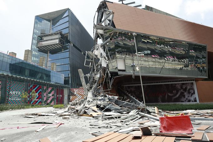 Vista del derrumbe parcial que sufrió un centro comercial hoy, jueves 12 de julio de 2018, en el Pedregal, sur de Ciudad de México (México). Por el momento no se han reportado personas atrapadas o heridas. Decenas de usuarios de las redes sociales captaron las imágenes del derrumbe, en las que se ve cómo la fachada se desprende y los escombros caen en una zona previamente acordonada. EFE