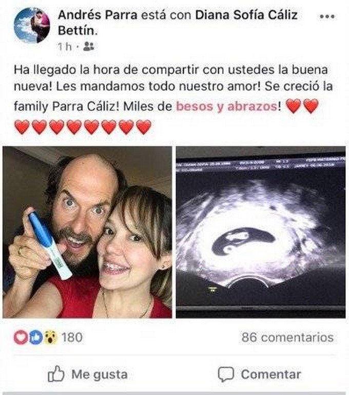 Por medio de Facebook, el actor Andrés Parra anunció que él y su esposa, Diana Sofía Cáliz se convertirán en padres por primera vez.