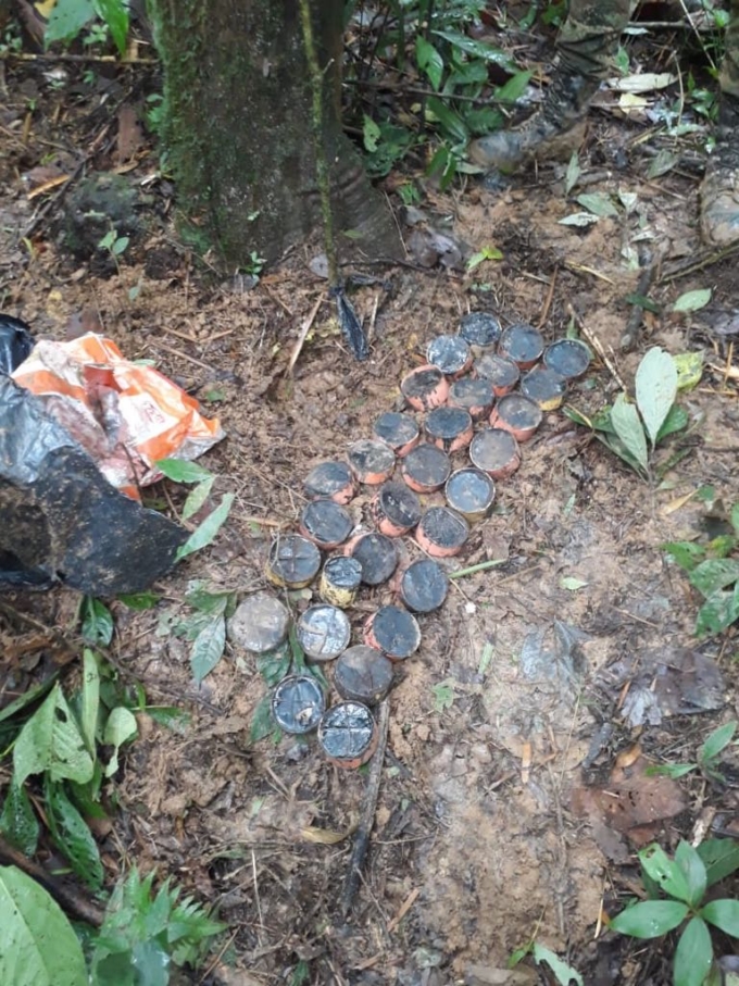 En la vereda Yavia del municipio de Uribe en Meta, se ubicó y destruyó un depósito ilegal con 29 minas antipersonal, elaboradas en tubo de PVC y selladas con brea negra.