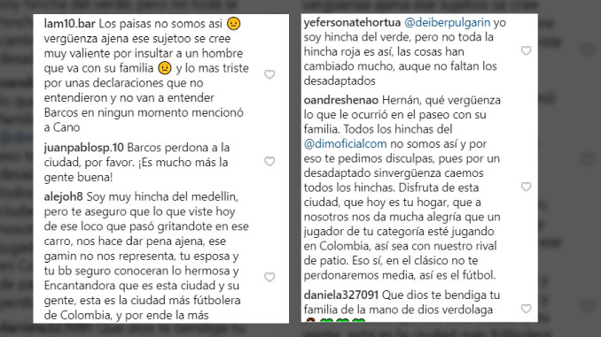 En el post, tanto hinchas de Nacional como de Independiente Medellín le han dejado saludos y disculpas al jugador argentino por el comportamiento de una persona que no representa el sentir de la ciudad.