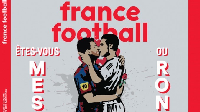 La revista France Football, reconocida por ser la encargada de entregar el premio del Balón de Oro, publicó una controversial portada en su última edición, en esta sale la ilustración del artista urbano ‘Tvboy’ en la que Lionel Messi y Cristiano Ronaldo se están dando un apasionado beso.