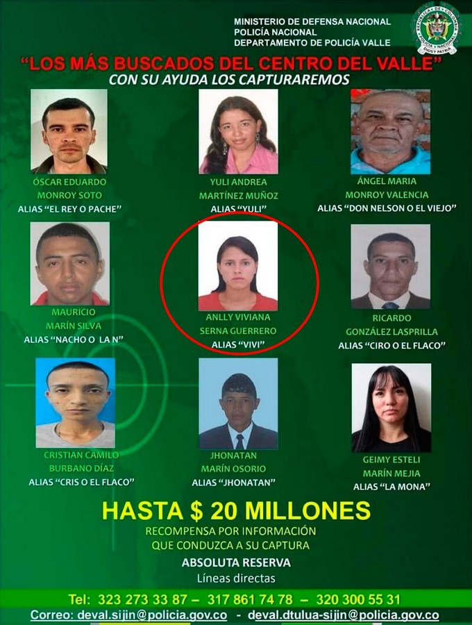 Serna es la segunda persona, presente en el cartel de los nueve delincuentes más buscados del Valle que es capturada. Esto, luego de que el 22 de abril pasado fuera capturado Cristian Camilo Burbano Díaz, alias Cris o El Flaco quien fue cobijado con medida de aseguramiento en establecimiento carcelario.