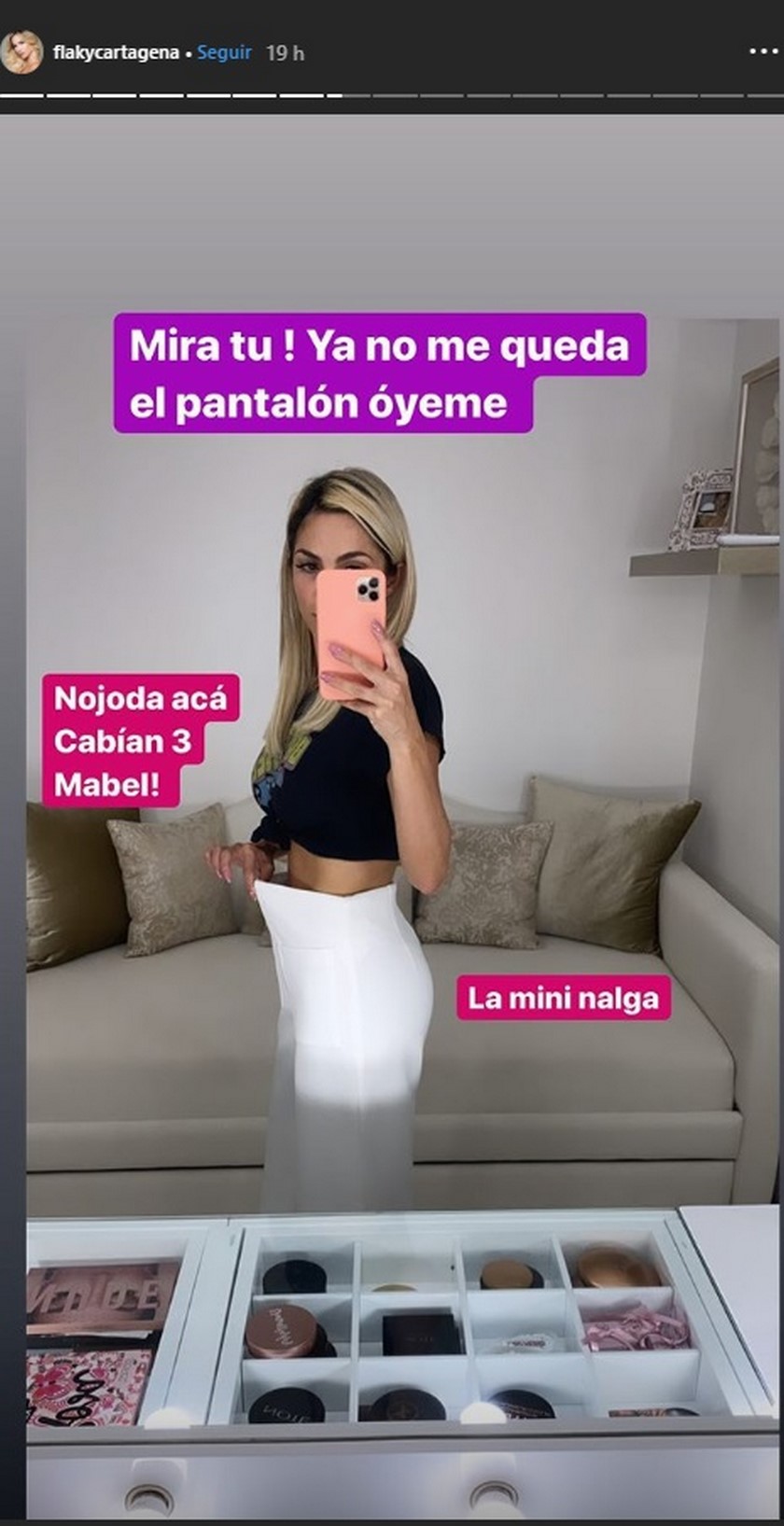 Por medio de sus estados de Instagram, Mabel se puso un pantalón de color blanco con el cual mostró que está tan flaca que se ha quedado “desnalgada” y dice que en el “cabían 3 Mabel”.