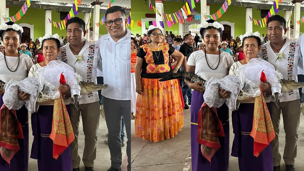 La caimán vestida con su traje de novia blanco, con adornos plateados, y trasladada al palacio municipal para casarse con el alcalde.
