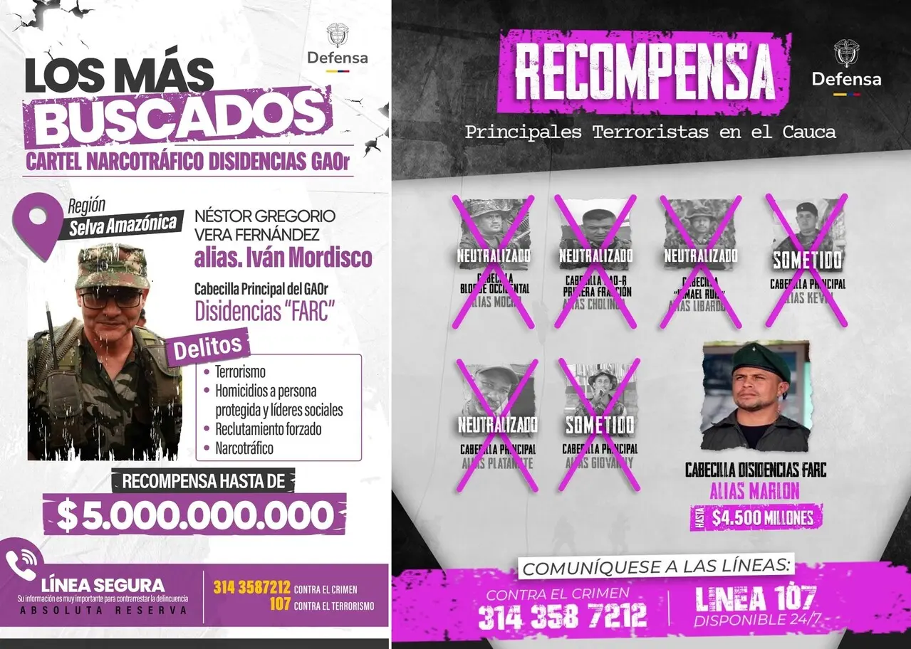 Se ha emitido una recompensa por información que permita dar con el paradero de alias “Marlon”, señalado como un cabecilla “desquiciado y perverso” bajo las órdenes de “Iván Mordisco”, responsable directo de coordinar estas acciones terroristas.