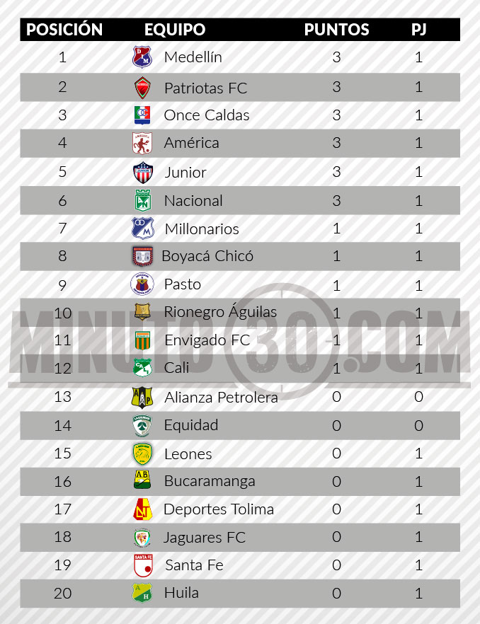 A falta de un partido para completar la fecha 1 de la Liga Águila I-2018, el Independiente Medellín es líder tras golear por 3 goles a 0 en el Atanasio Girardot al Atlético Huila.
