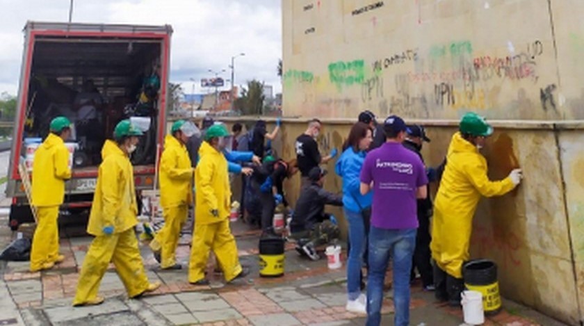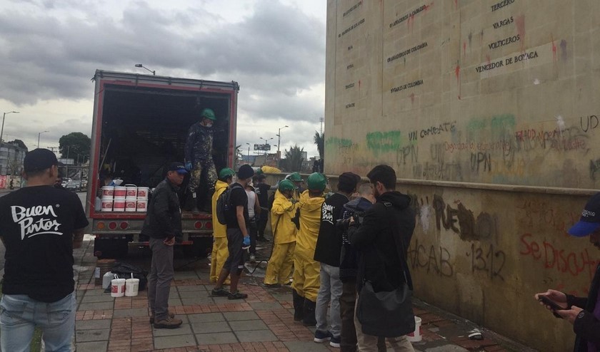 Cerca de 10 ciudadanos que tenían infracciones del Código de Policía participaron en una jornada comunitaria que incluyó el inicio de la limpieza del Monumento A Los Héroes que fue víctima del vandalismo nuevamente y requiere recuperación.