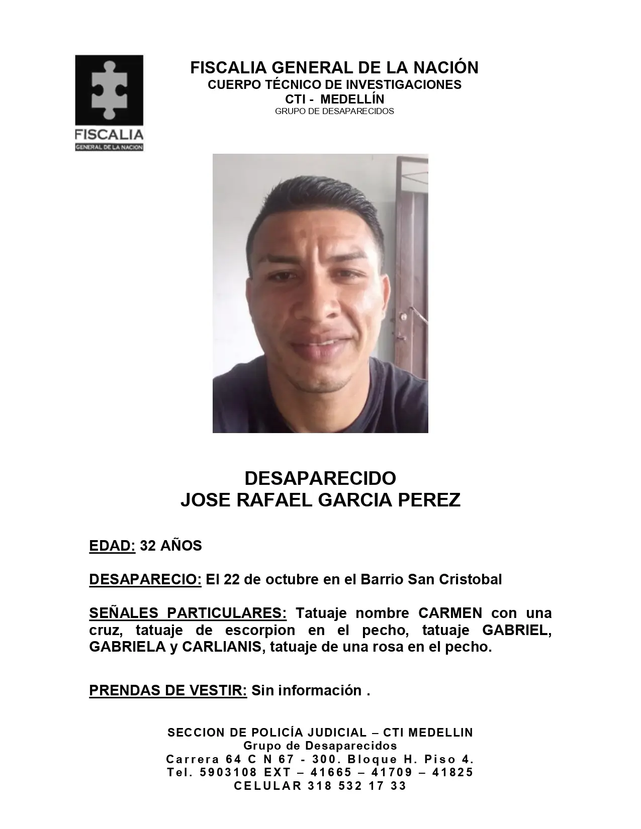 Minuto30.com .- José Rafael García Pérez, de 32 años de edad, se encuentra desaparecido desde el pasado 22 de octubre de 2025 en el Barrio San Cristóbal de Medellín. La Fiscalía General de la Nación ha emitido una alerta de búsqueda para su pronta localización.