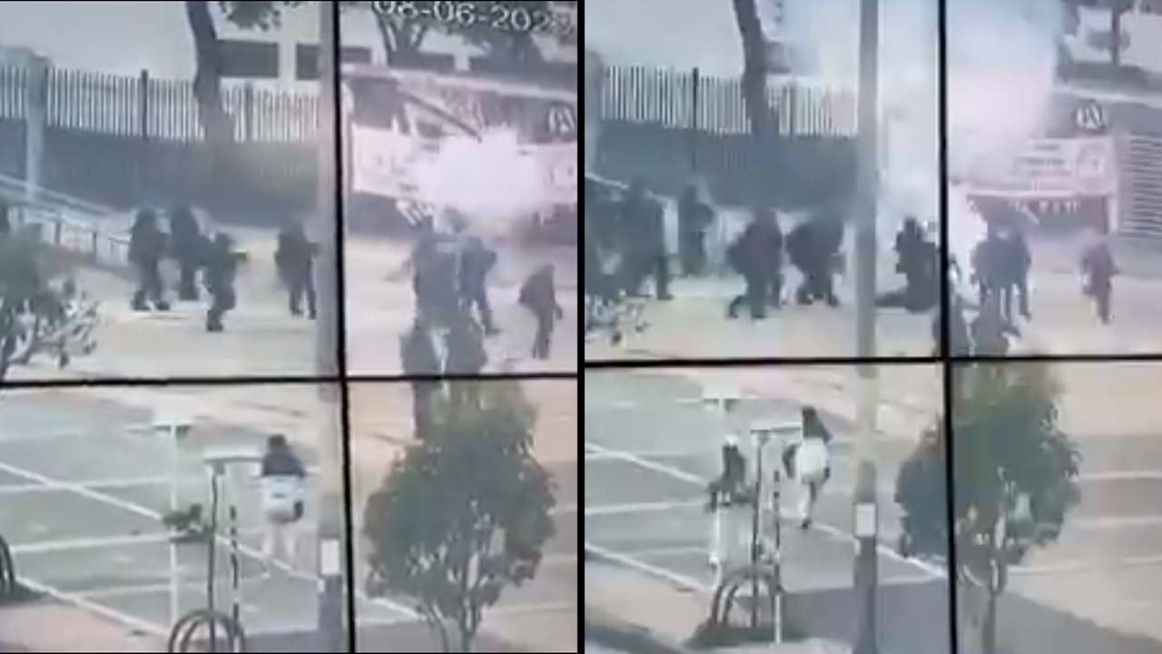 En el video de las cámaras de seguridad se observa cuando la papa bomba explota y el resto de policías proceden a protegerlo para sacarlo del lugar.
