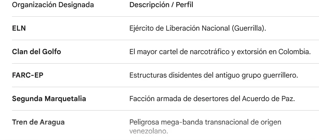 La designación abarca a los principales actores armados responsables de narcotráfico, extorsión, secuestro y homicidios en la región: