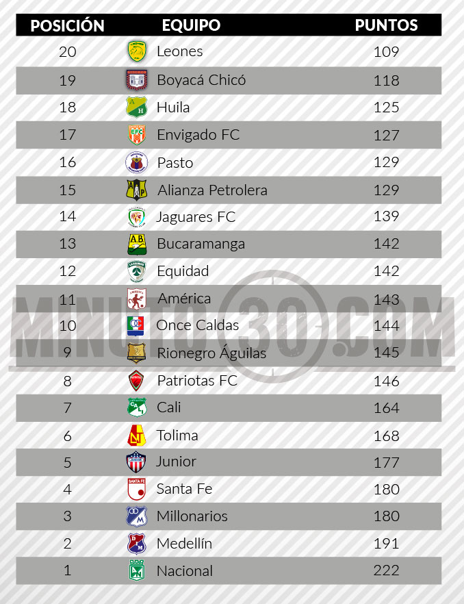 Minuto30.com- Leones Itagüí y Boyacá Chicó cada vez tienen menos posibilidades de mantenerse en la primera división del fútbol profesional colombiano. El conjunto antioqueño es último en la tabla del descenso con 109 puntos, mientras que el equipo boyacense ocupa la penúltima plaza, con 1118. De mantenerse en esta plazas, ambos perderán la categoría al […]
