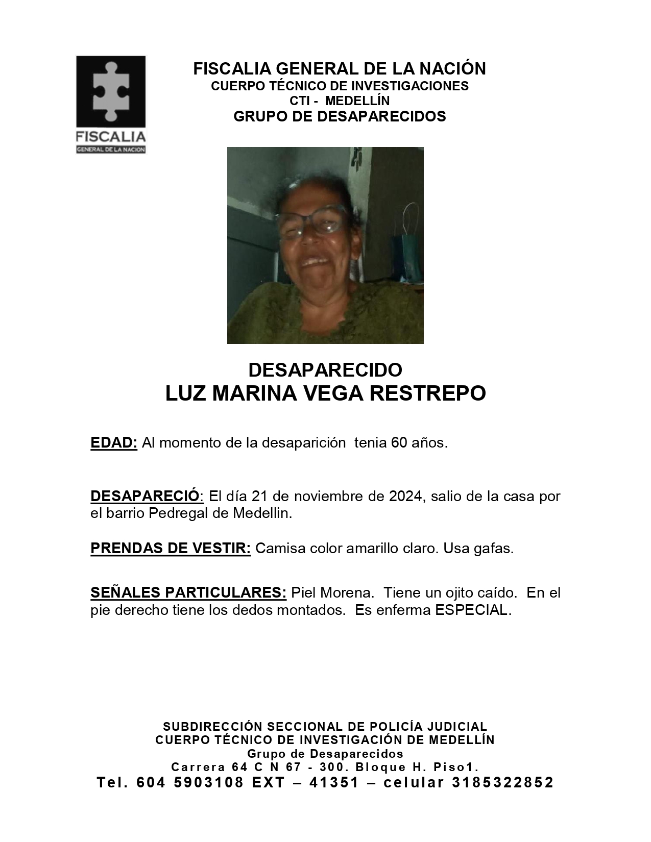 Minuto30.com .- Las autoridades y familiares de Luz Marina Vega Restrepo, una mujer de 60 años, se encuentran en búsqueda activa tras su desaparición el pasado 21 de noviembre de 2024. La mujer fue vista por última vez en el barrio Pedregal, al noroccidente de Medellín, desde donde salió de su casa sin dejar rastro.