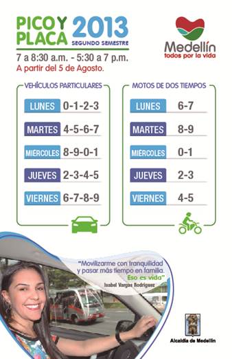 Minuto30.- A partir de este lunes 5 de agosto inicia la rotación de la medida de Pico y Placa para vehículos particulares y motos de dos tiempos en Medellín, según se estipula en el Decreto 1308 de 2013. Los taxis continúan con la rotación establecida para ellos.