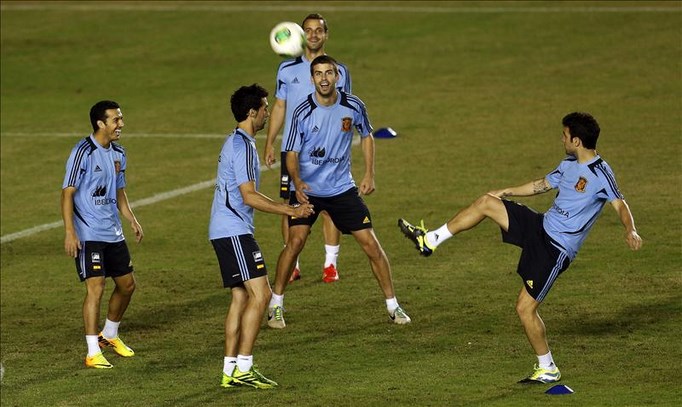 Los jugadores de la selección española Pedro Rodríguez (i), Cesc Fábregas (d), Roberto Soldado (atrás) y Gerard Piqué (c) durante un entrenamiento en Río de Janeiro (Brasil). EFE