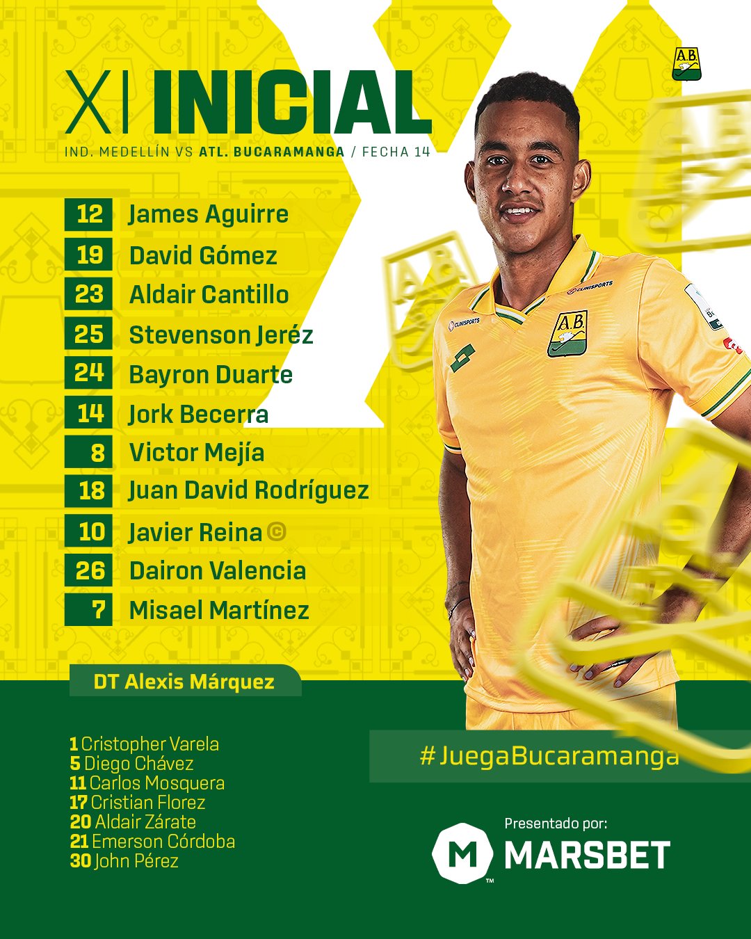 En el banco de suplentes, Alexis Márquez contará con Cristopher Varela, Diego Chávez, Carlos Mosquera, Cristian Flórez, Aldair Zárate, Emerson Córdoba y John Pérez.