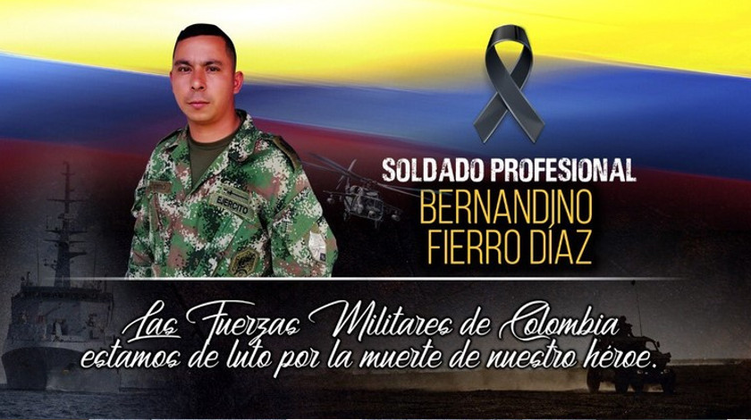“Unos sujetos abrieron fuego e hirieron a los soldados Luis David Ménese Ramírez y Bernandino Fierro Díaz. De manera inmediata los enfermeros de combate les prestaron los primeros auxilios, para luego ser trasladados al puesto de salud más cercano, pero desafortunadamente en el desplazamiento Fierro Díaz murió a causa de las heridas”, informó la institución.
