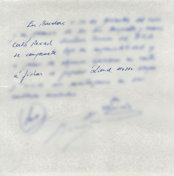"En Barcelona, a 14 de diciembre del 2000 y en presencia de los Srs. Minguella y Horacio, Carles Rexach, secretario técnico del FC Barcelona, se compromete bajo su responsabilidad y a pesar de algunas opiniones en contra a fichar al jugador Lionel Messi siempre y cuando nos mantengamos en las cantidades acordadas", decía la servilleta.