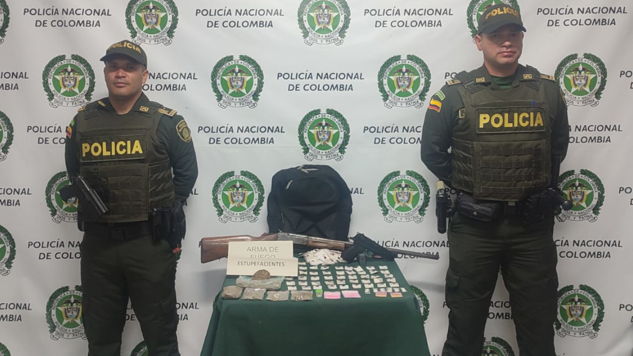La Policía Nacional encontró, abandonado, en zona rural del municipio de El Retiro, fue un arma de fuego tipo pistola, calibre 9mm, un arma de fuego tipo escopeta, 750 gramos de marihuana, 740 gramos de bazuco, 15 gramos de tusibí, 10 gramos de base de coca, dos gramos de heroína y 760 gramos de cocaína.