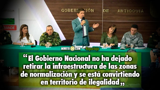 Debido al abandono de las zonas de normalización en diferentes partes del departamento, esos escenarios podrían convertirse en un peligro para el orden público de Antioquia, así lo manifestó el gobernador, Luis Pérez Gutierrez, quien agregó que el gobierno nacional no ha permitido retirar la infraestructura que está siendo utilizada como territorio de ilegalidad y de violencia