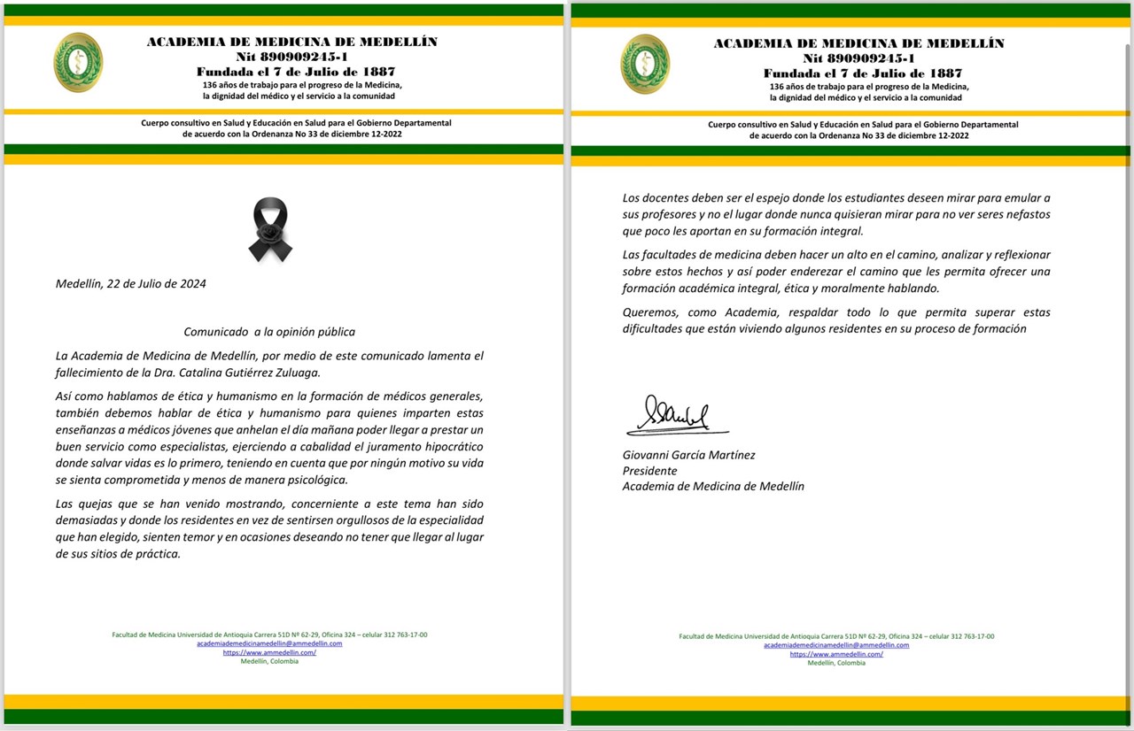 Minuto30.com .- Luego de que se conociera que el pasado 17 de julio fue hallada muerta Catalina Gutiérrez Zuluaga, residente de Medicina de la Universidad Javeriana en lo que sería un lamentable caso de acoso académico, la Academia de medicina de Medellín se pronunció.