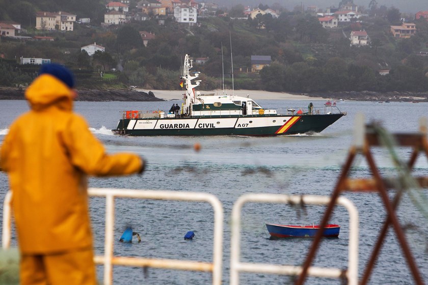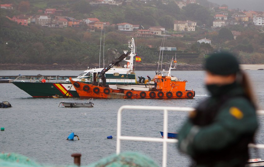 La Guardia Civil retoma este martes desde el puerto de Aldán, en Cangas de Morrazo (Pontevedra), la operación para remolcar el “narcosubmarino” cargado con tres mil kilos de cocaína y hundido en la madrugada del domingo en la ría de Aldán. EFE/ Salvador Sas