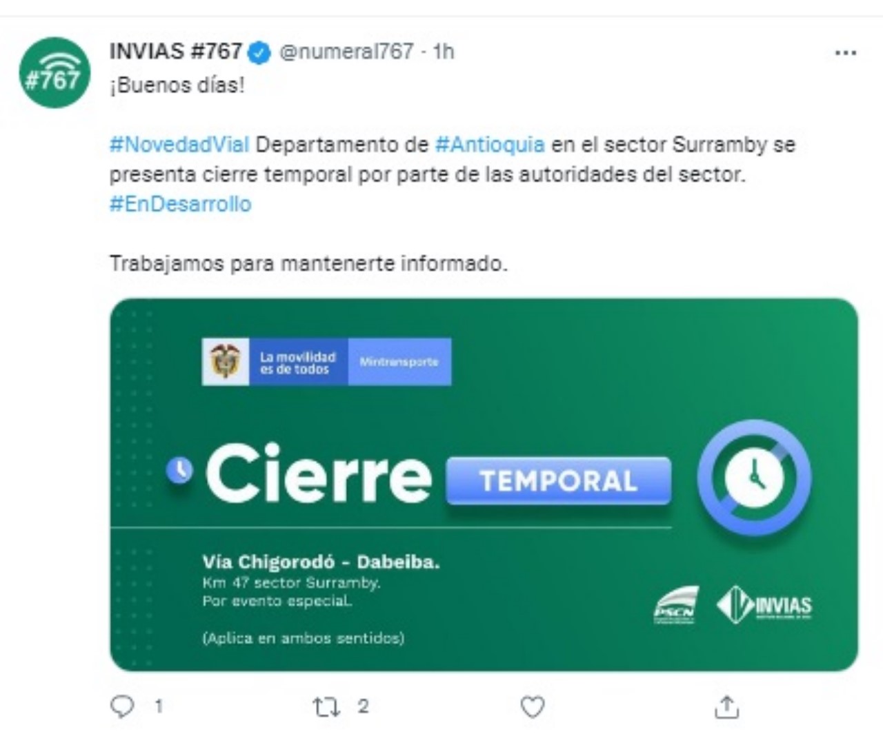 Otra de las vía que presenta cierre, de acuerdo a INVIAS, es el km 47 sector Surramby en la vía Chigorodó – Dabeiba. “Departamento de #Antioquia en el sector Surramby se presenta cierre temporal por parte de las autoridades del sector”, detallaron en Twitter, y afirmaron que aplica para ambos sentidos.
