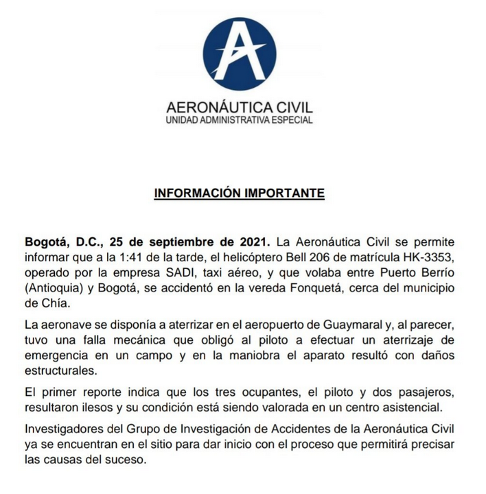 La tarde de este sábado 25 de septiembre, un helicóptero que salió desde Puerto Berrío, Antioquia, con rumbo a la capital del país, se accidentó en la vereda Fonquetá.