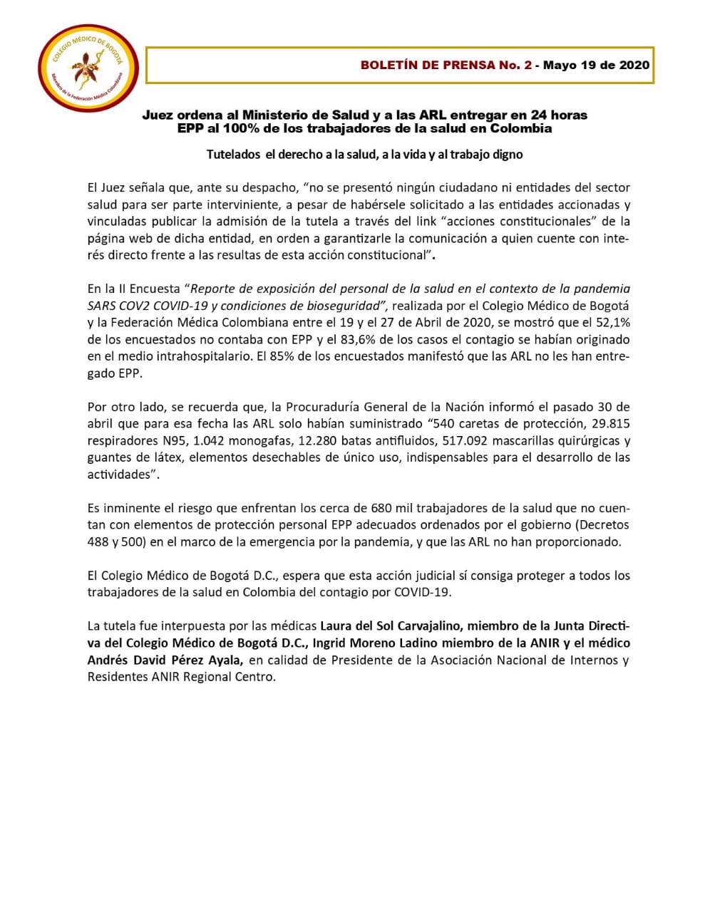 La Rama Jurisdiccional del Poder Público, mediante el juzgado primero de familia de oralidad de la ciudad de Bogotá, falló una acción de tutela que ordena al Ministerio de Salud entregar en 24 horas elementos de protección personal a los trabajadores de la salud en Colombia.