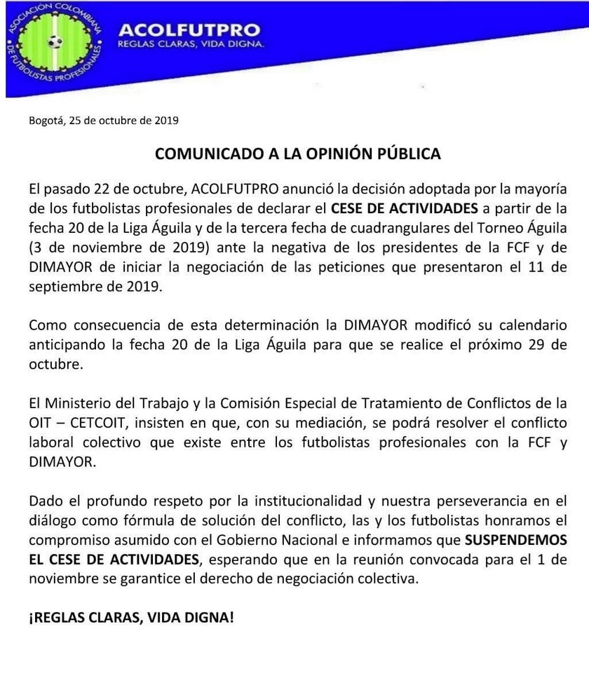 Minuto30.com- La Asociación de Futbolistas Profesionales de Colombia emitió en las últimas horas un comunicado en el que informa que el paro programado para la fecha 20 de la Liga Águila se suspenderá.