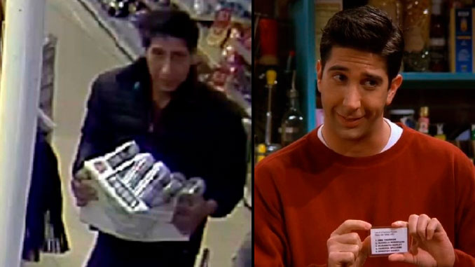Los oficiales compartieron el vídeo de una cámara de seguridad en el que se ve un hombre, que es la “copia exacta” (como muchos usuarios en Internet lo apodaron) de Schwimmer, agarrando una caja de cerveza.