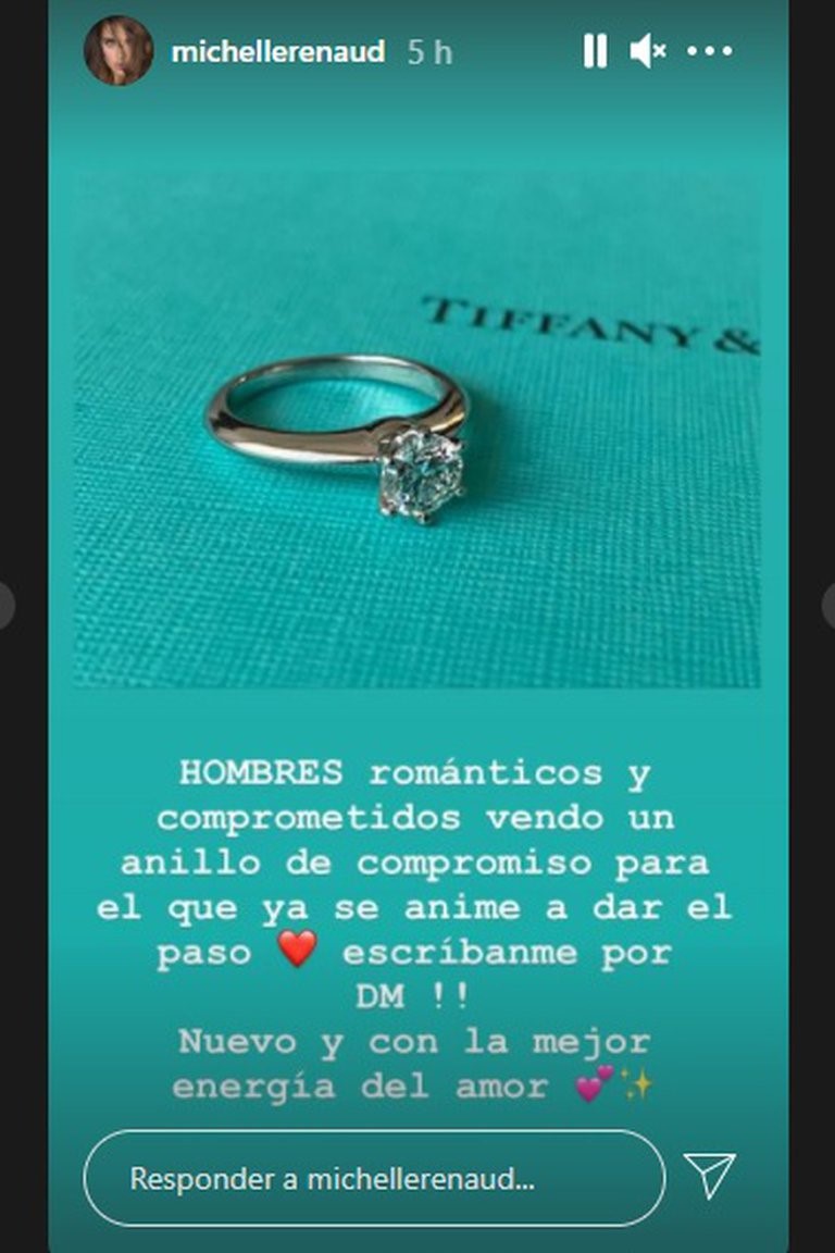 A través de sus historias de Instagram, Michelle Renaud escribió: “hombres románticos y comprometidos, vendo un anillo de compromiso para el que ya se anime a dar el paso, escríbanme por DM. Nuevo y con la mejor energía del amor”. En el anuncio deja ver el anillo de compromiso de la marca Tiffany & Co, una tienda de prestigio y de calidad cuando de anillos de matrimonio se trata.