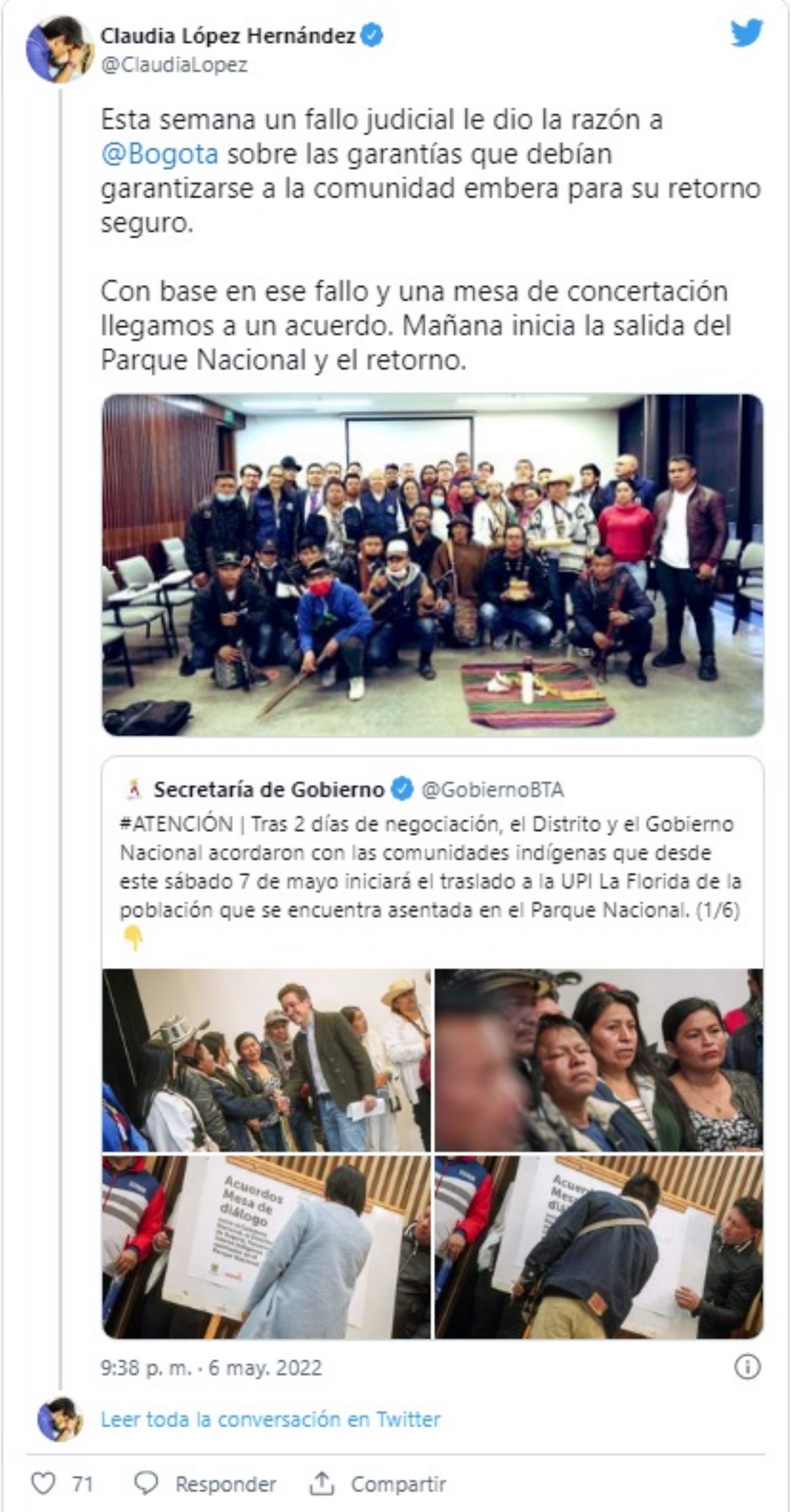 “Gracias a la comisionada de la Comisión de la Verdad, Patricia Tobón, y al Defensor para la Conflictividad, Jorge Calero, pudimos avanzar en un dialogo fructífero y exitoso con los indígenas que se encontraban en el parque Nacional. También agradezco a los indígenas y a quienes ofrecieron acompañamiento para sacar adelante este acuerdo”, dijo Felipe Jiménez, secretario distrital de Gobierno.