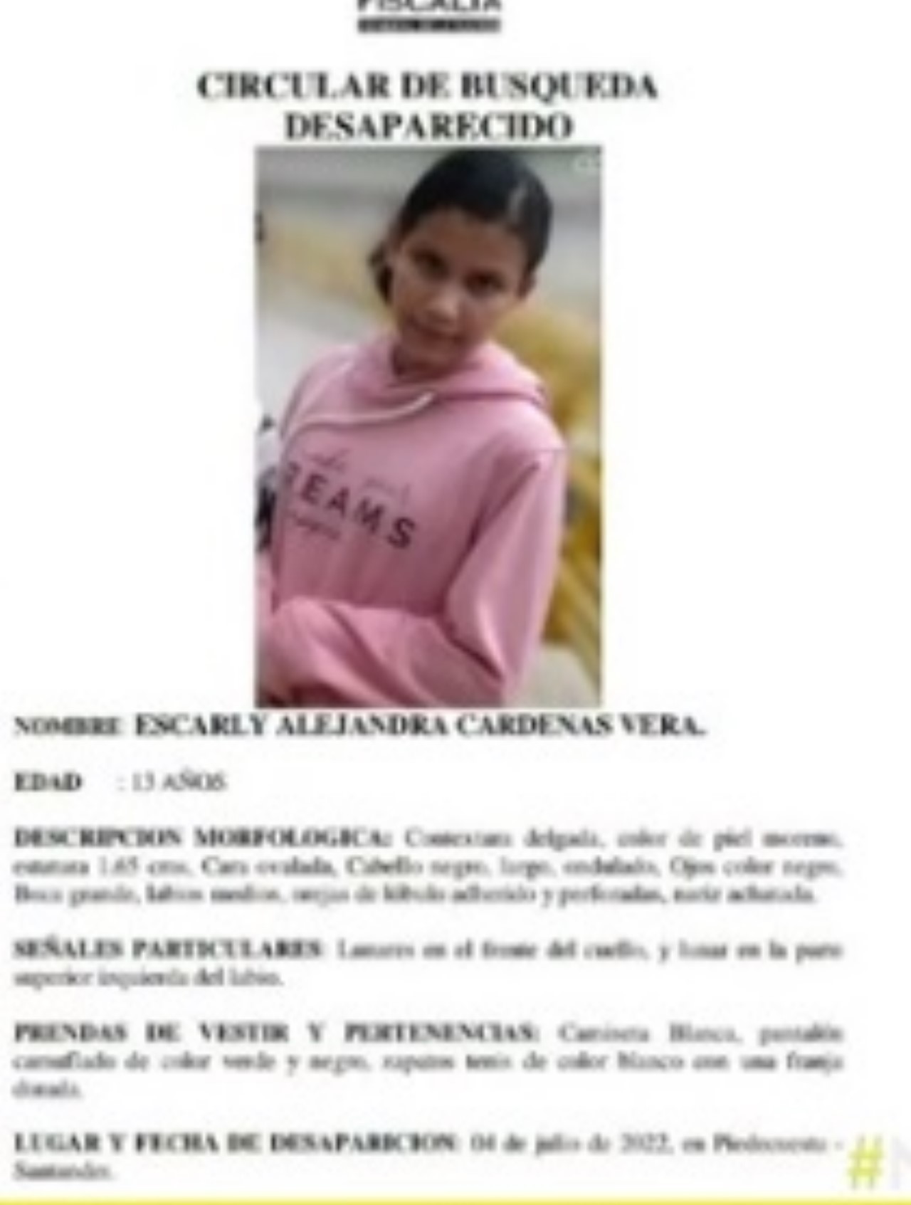 Escarly Alejandra Cárdenas desapareció el pasado lunes festivo, 4 de julio, tras encontrarse con un joven tres años mayor que ella, que había conocido en redes sociales.