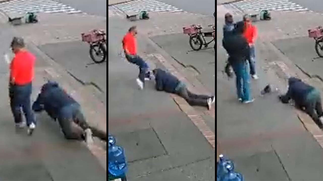 Este impresionante video que fue compartido en Twitter por la hija del señor que por un tropiezo se va al suelo, y que en intentó o en una reacción inconsciente, buscó agarrarse de quién tenía más cerca, pero esta persona no lo tomó para bien y primera respuesta, fue agarrarlo a matadas en la cara.