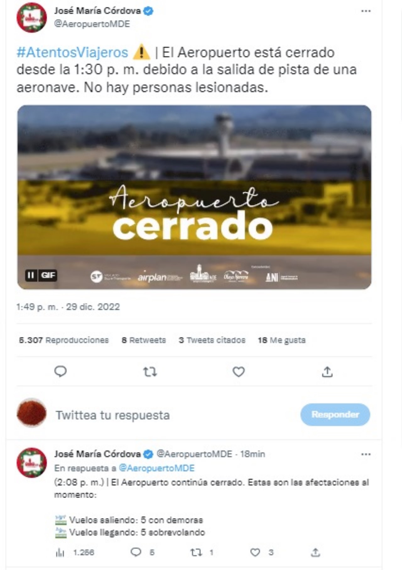 A esta hora reportan, Excursión de pista en el @AeropuertoMDE cerrado sin estimado de apertura. #EnDesarrollo / #GuardianesAntioquia pic.twitter.com/WolEUKNIKd