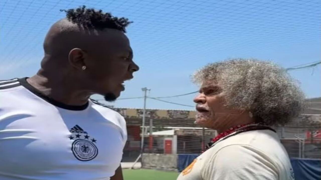 Lo que al principio era un juego amistoso y estaba siendo grabado, se tornó en un encontrón del Pibe Valderrama y el ahora influencer Murillo Flow. “¡Esta es mi casa!”, gritó Murillo, a lo que el jugador 10 de la Tricolor le contestó con su habitual desparpajo: “¡Aquí estoy m…!“. Pero la cosa no se quedó ahí porque la pelea siguió: “¡Respetar ni que mondá!”, continuó el ‘Pibe’, haciendo gala de su costeño y palabras de trato de la Costa Atlántica. “¿Qué crees? ¿Qué vas a coger los mangos bajitos? Tienes que subirte al palo”.