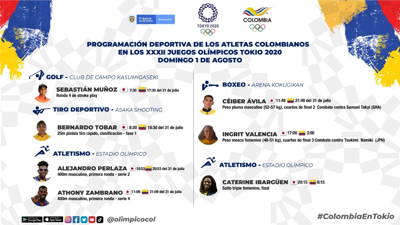 Programación deportiva de Colombia en los Juegos Olímpicos #Tokyo2020 para el domingo 1 de agosto. 🏌️♂️🏃♀️🥊🏃♂️