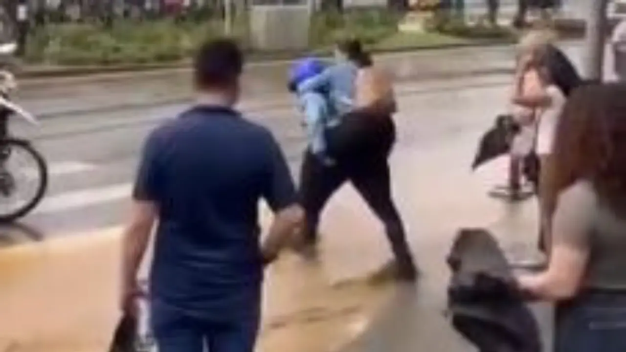 La escena, captada en video por testigos de la zona, muestra cómo el uniformado, sin dudarlo, protegió a la ciudadana para evitar que fuera alcanzada por la corriente o se empantanara en el lodo que cubría las vías.
