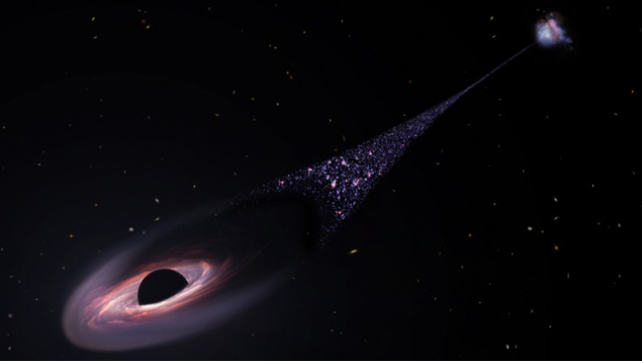 Un enorme agujero negro atraviesa el espacio y deja tras de sí una estela de estrellas recién nacidas de 200.000 años luz de extensión, de acuerdo con científicos espaciales en Estados Unidos.