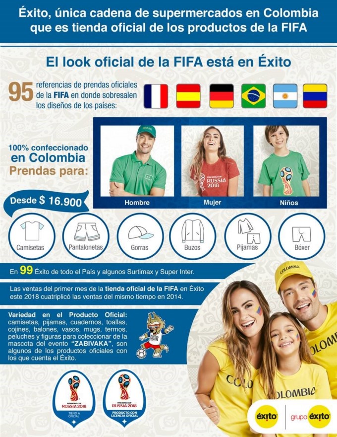 Todo el “look” oficial de la FIFA se puede encontrar en el Éxito, que cuenta con 95 referencias de prendas oficiales en donde sobresalen los diseños de países como Colombia, Argentina, Brasil, Alemania, España y Francia.
